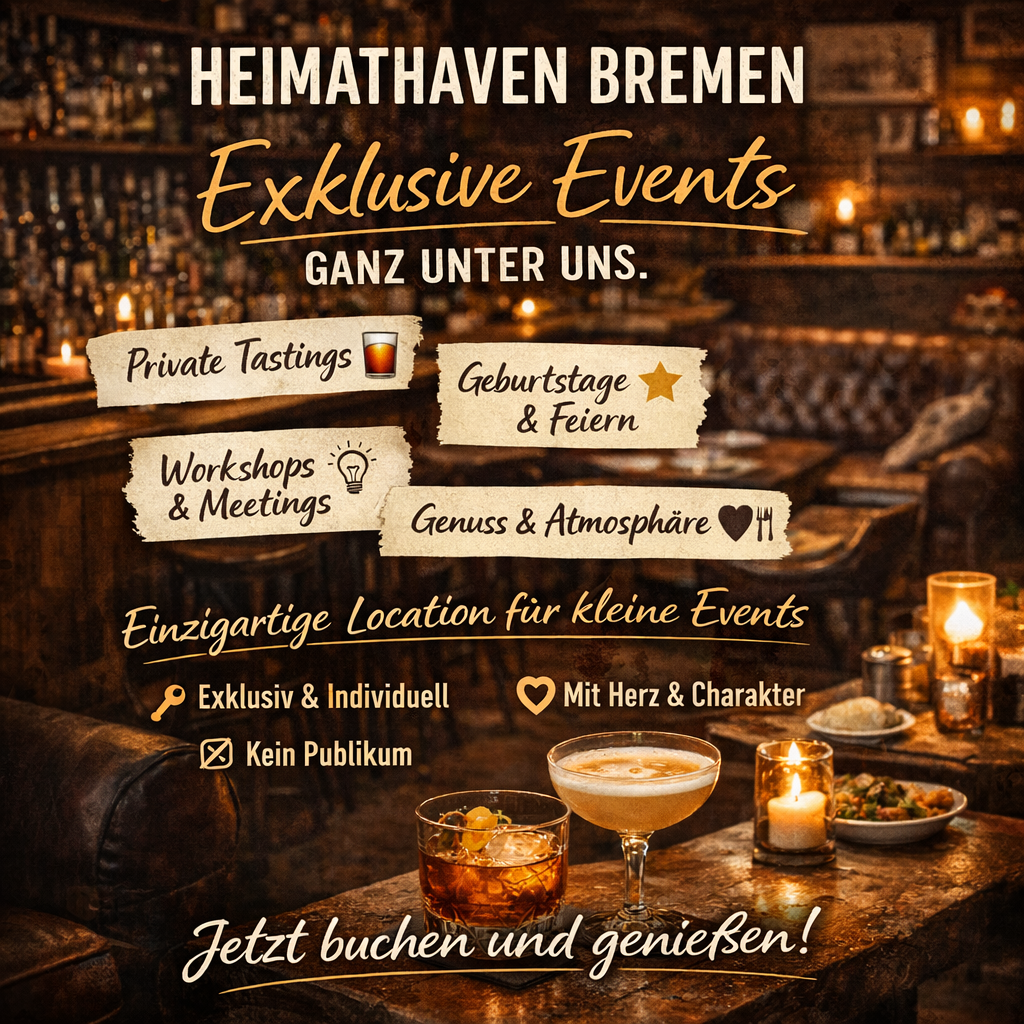 Der Heimathaven bietet den perfekten Rahmen für kleine, ausgewählte Veranstaltungen, bei denen Atmosphäre wichtiger ist als Quadratmeter.